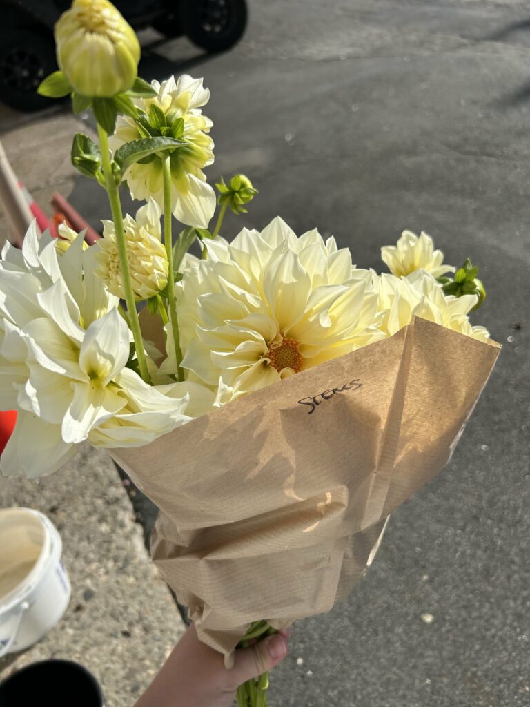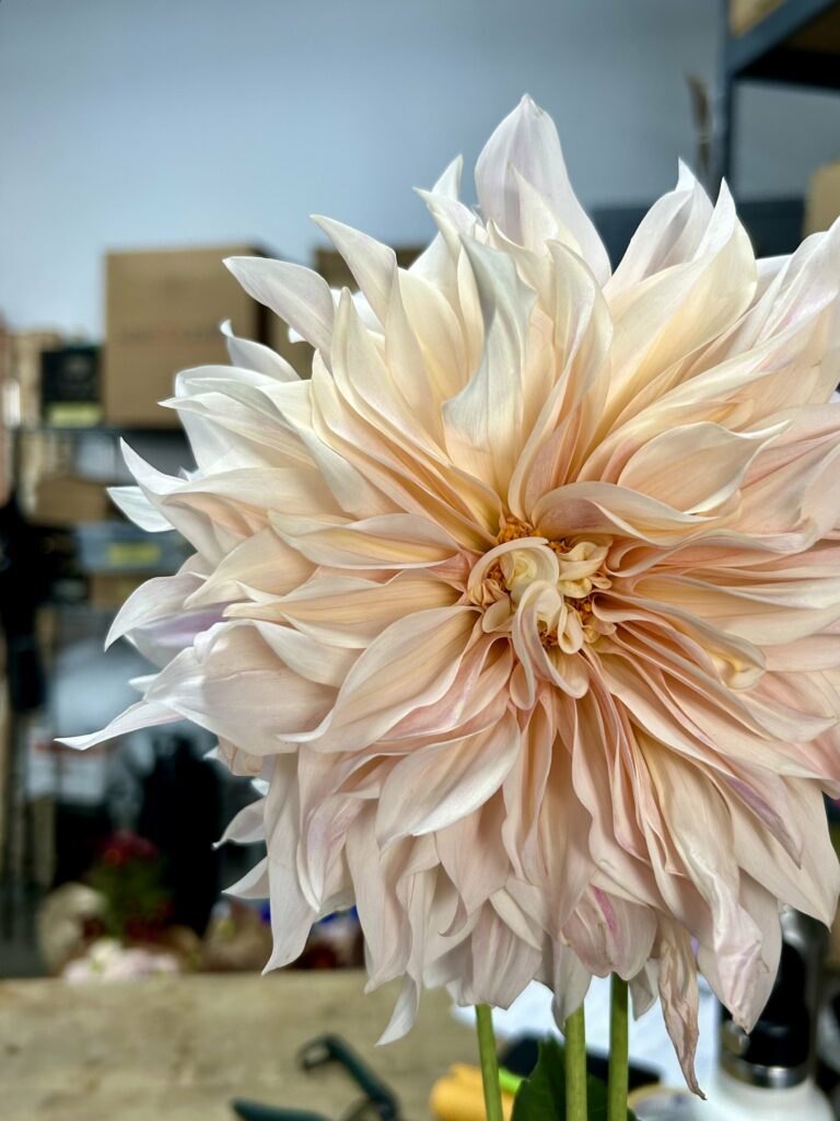 Part of the appeal of this dahlia is its ephemeral nature. What’s so challenging about this particular variety of dahlia is its shelf life; Cafe Au Laits are notoriously finicky, drooping in high temperatures and only lasting a few days from harvest to wilt. For us, this means we’re careful in how we use these dahlias. We wouldn’t use these in a wedding bouquet for an August wedding anymore- it’s just not worth the risk of a big dead flower in the middle of your bouquet!