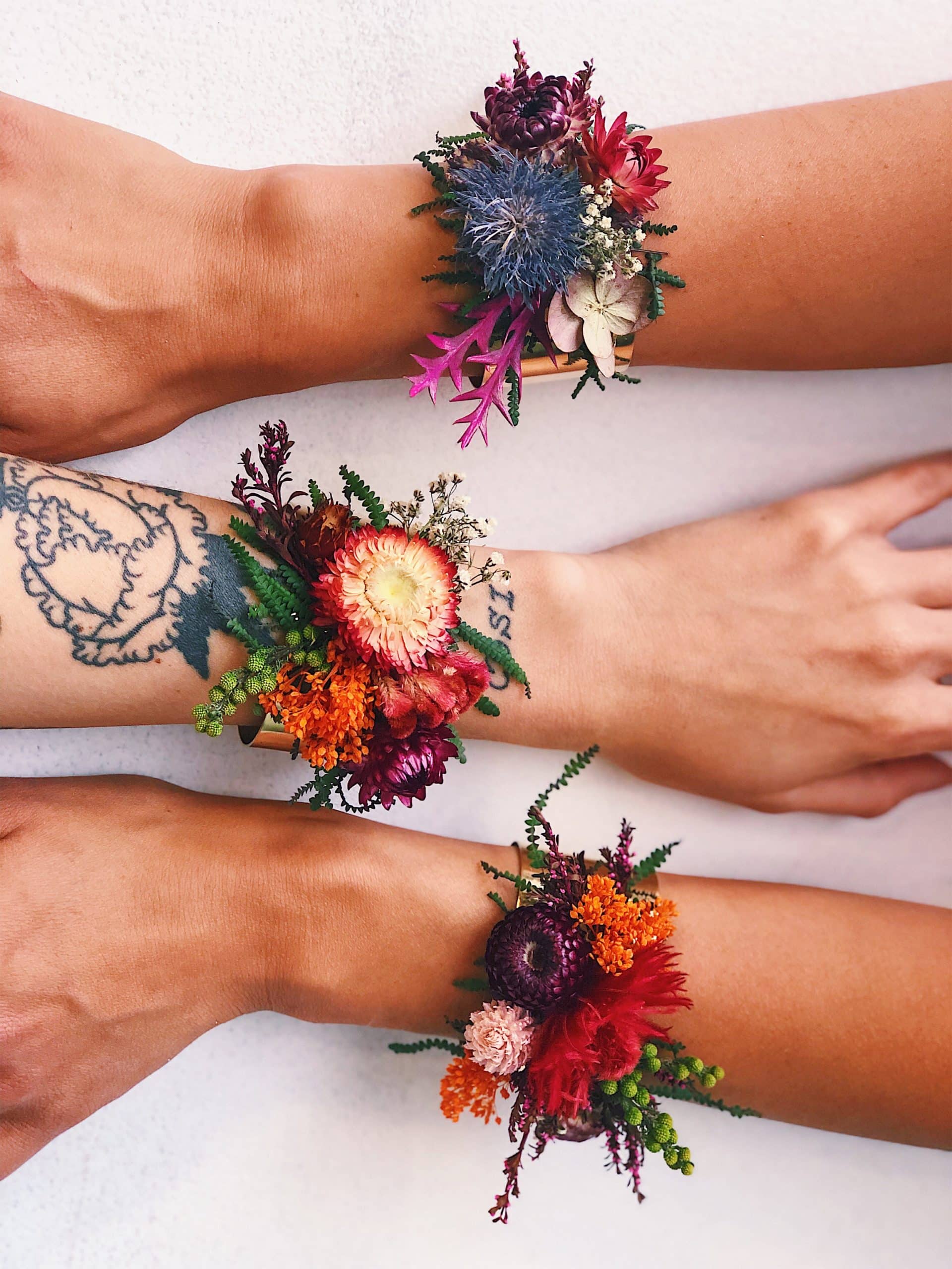 Keeping with a traditional flower design but with an unconventional twist – our corsages are made on adjustable keepsake brass cuffs. It’s a revised design with seasonal flowers that you can rock at a prom, wedding or any day of the week!